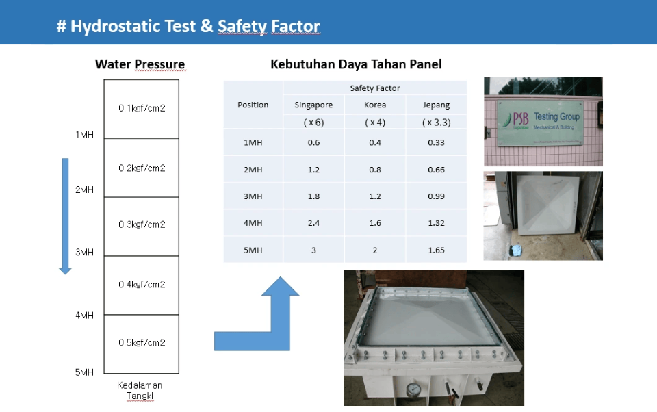 AZTank FRP mengikuti standar internasional (SS245 Singapura / KS4811 Korea) beberapa kali lipat dari spesifikasi tekanan tangki air. Contoh kami memasang dengan kekuatan daya tahan tekanan di angka 100 dan mempertahankan kekuatan pada angka 75 setelah 15 tahun terpasang, meskipun menurut kebutuhan daya tahan hanya dibutuhkan di angka 25 tekanan air. Lebih lanjut, kami memiliki konsep dan standar metode pengujian yang digunakan untuk desain ini. Kami memakai metode pengujian FEM (Finite Element Method) dan konsep SAFETY FACTOR.