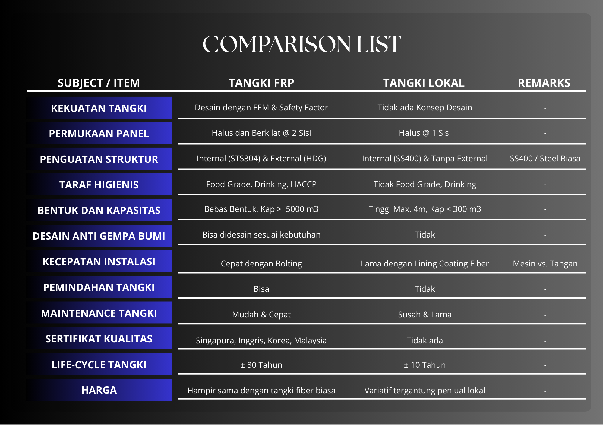 Di sisi lain, tangki FRP lokal perlu dibongkar jika ingin dipindahkan, terlebih karena semua bagian sudah dilapis dengan Fiberglass secara keseluruhan sehingga panel harus dipotong, dan panel yang dipotong tidak dapat digunakan kembali. Selengkapnya...